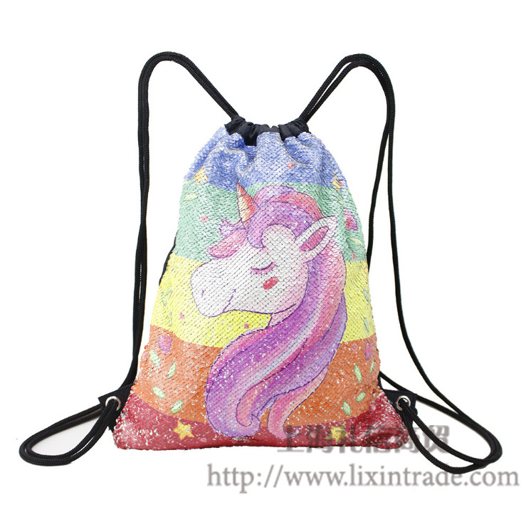 爆款独角兽印花5mm翻片亮片束口袋抽绳背包